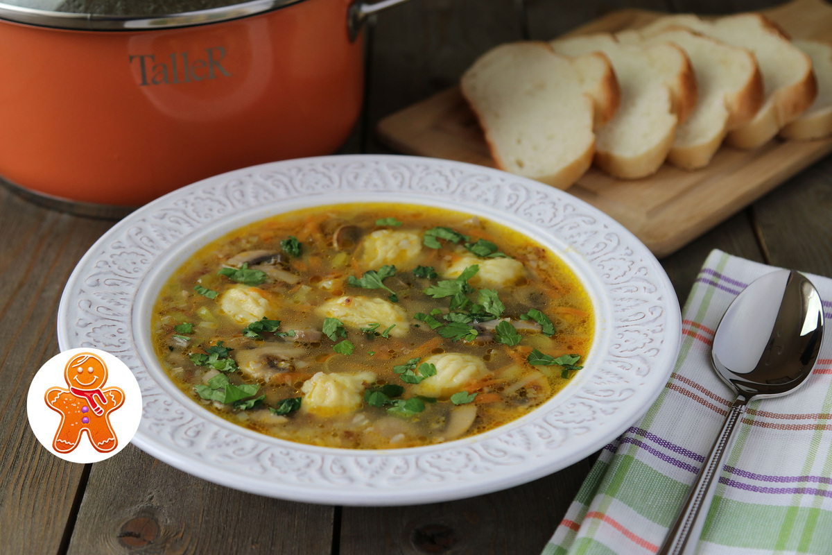 Как только клецки готовы, обратно в суп возвращаем обжаренные грибы и морковь, добавляем специи по вкусу и, как следует, перемешиваем. Блюдо становится всё более ароматным и аппетитным. Разливаем суп по тарелкам, посыпаем свежей зеленью и подаем к столу, пишет Дзен-канал "Готовим с Ириной Хлебниковой".