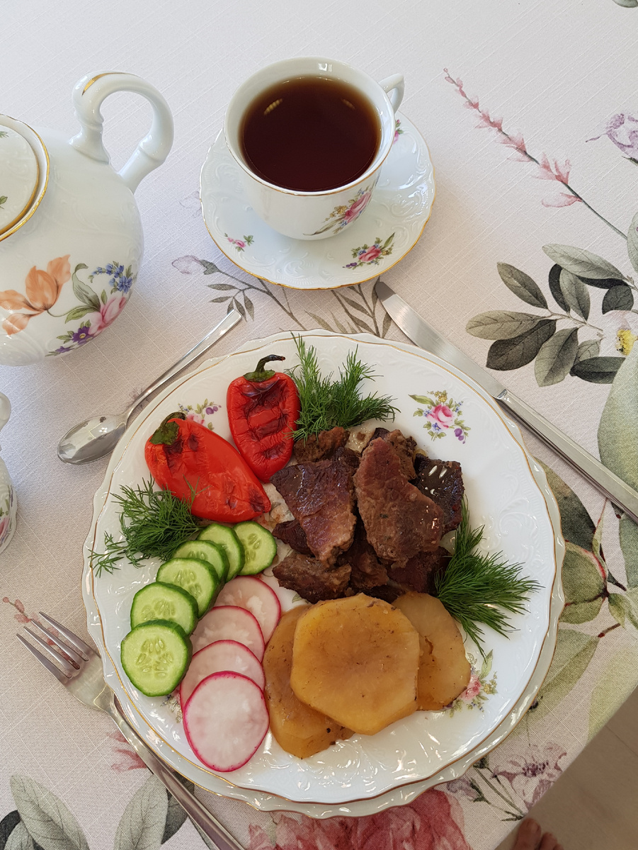 Теперь осталось лишь запечь блюдо в разогретой до 180 градусов Цельсия духовке в течение 80 минут. Как только время выйдет, аккуратно разложите по тарелкам ароматное мясо и картошку, залив их образовавшимся бульоном. Для завершения можете добавить немного свежих овощей — гриль-перцы, огурцы и укроп отлично подойдут для сервировки.
