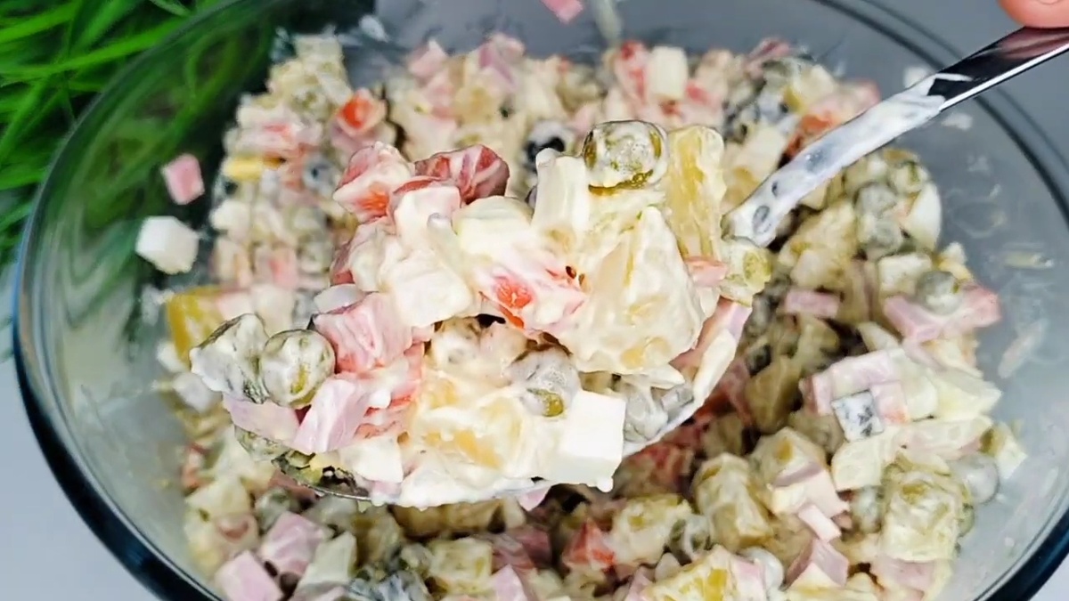 Важно уделить внимание выбору горошка — он должен быть свежим и мягким. Мясная составляющая может варьироваться в зависимости от вкуса: курица, говядина или ветчина, но докторская колбаса — оптимальный выбор.