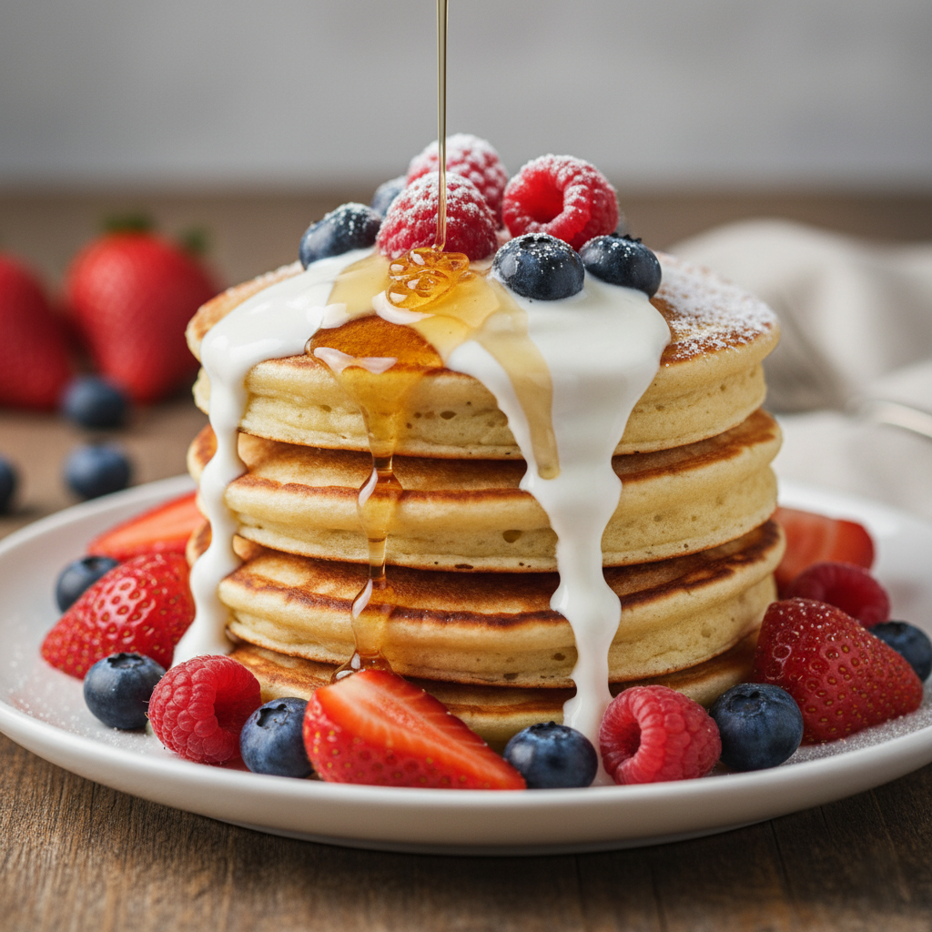 Приготовим панкейки с йогуртом, медом и ягодами — идеальная комбинация для стильного и полезного утра!
