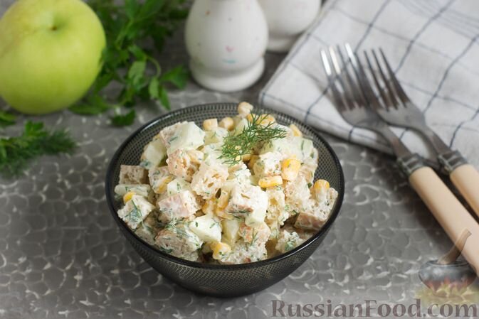 - Ингредиенты: куриное филе, болгарские перцы, сыр, кукуруза, лук, зелень, майонез, соль, черный перец.