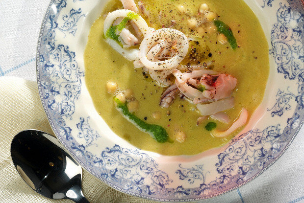 Лук, морковь и сельдерей нарезать крупными кусками. Обжаривать в глубокой кастрюле на оливковом масле около пяти минут, пока овощи не станут мягкими. Затем добавить розмарин, шалфей и пару зубчиков рубленого чеснока, а также томатную пасту. Жарить еще три минуты, при этом необходимо следить за температурой, чтобы чеснок не подгорел, иначе суп приобретет неприятный горьковатый вкус.Добавить в кастрюлю промытый консервированный нут и, если хотите, куриный или овощной бульон для большей насыщенности. Готовить около двадцати минут. После этого удалить розмарин и шалфей, добавить рубленую петрушку и пюрировать суп с помощью блендера. Приправить по вкусу.Кальмары, очищенные от пленок и костей, нарезать тонкими кольцами. Обжарить их на разогретом оливковом масле с двумя зубчиками чеснока 2–3 минуты. В конце добавить вторую банку нута, чтобы сохранить текстуру целых горошин, и вмешать в суп кольца кальмаров. Подавать горячим.Этот суп не только согревает, но и радует своим богатым вкусом. Простота приготовления делает его доступным для каждой хозяйки. Приятного аппетита!