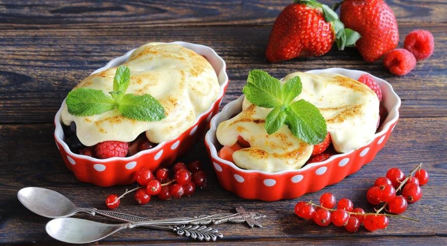 Взбить сливки с 1/4 стакана сахарной пудры до жестких пиков.В огнеупорной миске соединить яйца, желтки, цедру и сок апельсина. Постепенно добавлять 1/3 стакана сахара, непрерывно взбивая смесь до появления пены.Поставить полученную смесь на водяную баню и продолжать взбивать, пока объем не удвоится и не загустеет.Снять смесь с водяной бани и продолжать взбивать до комнатной температуры, около 4-5 минут. Затем вмешать взбитые сливки.Выложить ягоды в керамические формочки для запекания (крупные клубники разрезать на дольки). Полить ягодки соусом, посыпать оставшейся сахарной пудрой и поместить под разогретый гриль на 1-2 минуты, или карамелизовать с помощью газовой горелки. Подавайте немедленно.