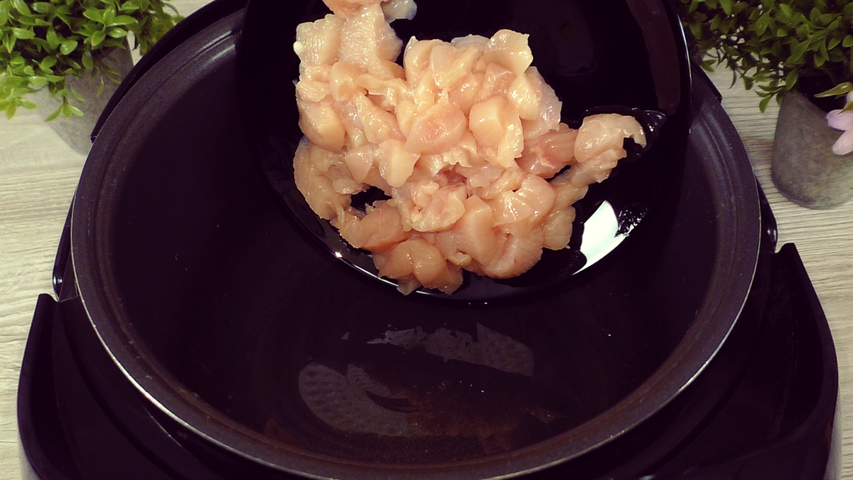 Для начала куриное мясо помещается в чашу мультиварки с небольшим количеством масла и обжаривается на режиме «жарка» до изменения цвета. Затем добавляются нарезанные лук и натертая на крупной терке морковь, которые жарятся еще 3-4 минуты до мягкости.