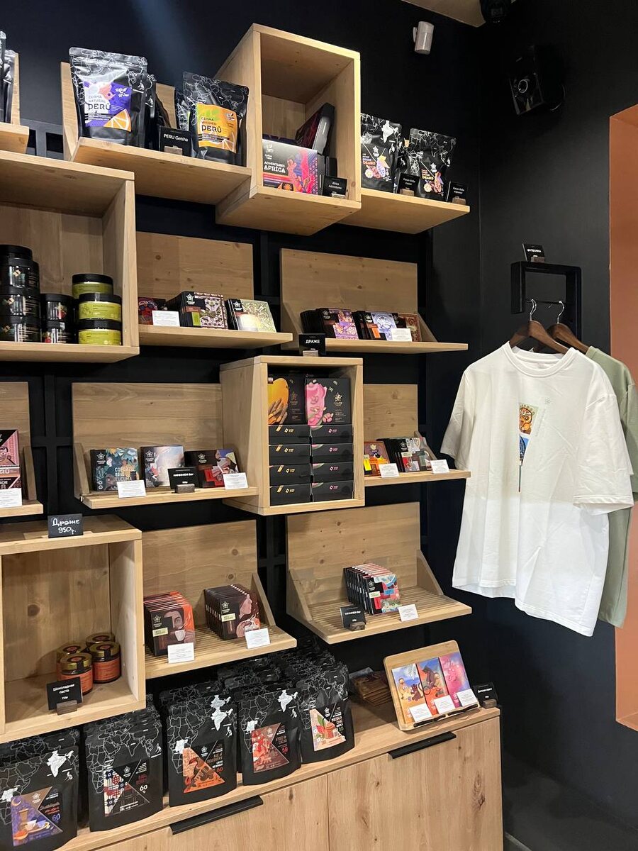 Кафе оформлено в латиноамериканском стиле, что особенно заметно в декоративных панно и орнаментах, отсылающих к древним цивилизациям, открывшим шоколад. У стены можно найти полки с разнообразным шоколадом, от плиток до напитков. Цены колеблются от 700 до 800 рублей за плитку, что делает эти лакомства не только вкусными, но и франшизными.