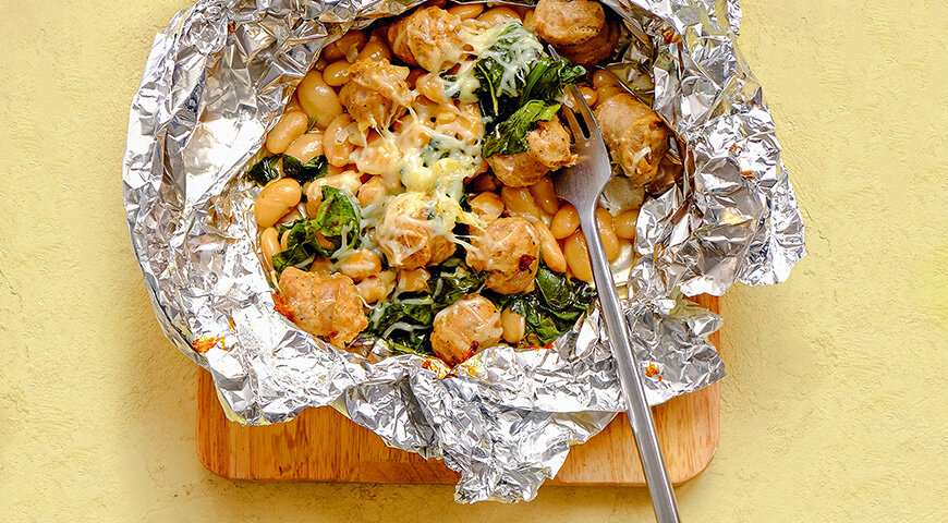 Приготовление: Разогрейте духовку до 200 °C, подготовьте листы фольги. Слейте жидкость из фасоли, нарежьте колбаски и шпинат. Соедините шпинат с фасолью и чесноком, приправьте и сложите в фольгу вместе с колбасками. Запекайте в духовке 25-30 минут.