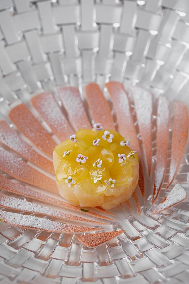 Вдохновляющим началом этого гастрономического путешествия станет тартар из дальневосточного гребешка. Этот изысканный морепродукт подается с айоли из тунца, дополненным виноградом, маринованным в соевом соусе и соке юдзу.