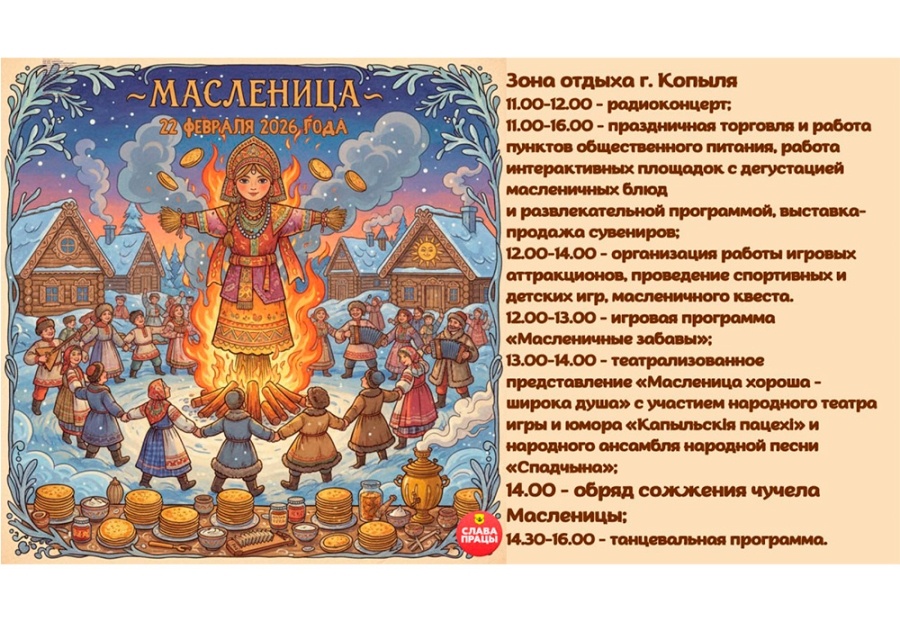 В Копыле 22 февраля разгорится настоящий праздник, который станет символом встречи весны и прощания с зимой! Жителей и гостей района приглашает на весёлую Масленицу, наполненную ароматами блинов и теплыми улыбками.