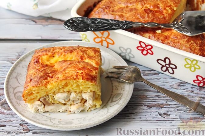 - Ингредиенты: куриное филе, сметана, твёрдый сыр, сливочное масло, яйца, мука, разрыхлитель, специи.