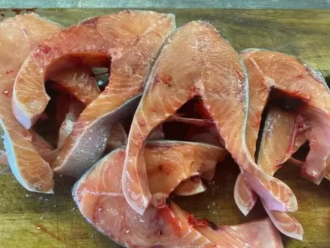 - Поместить кусочки рыбы в холодный соляной раствор (1 чайная ложка соли на 1 литр воды) на 5 минут.