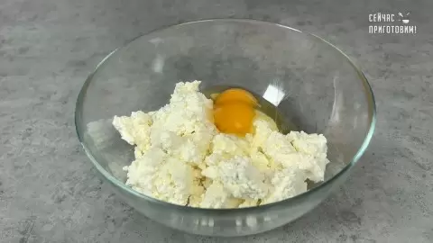 В глубокой миске соедините творог и два яйца. С добавлением сахара используйте погружной блендер для получения однородной массы, напоминающей детский творожок.