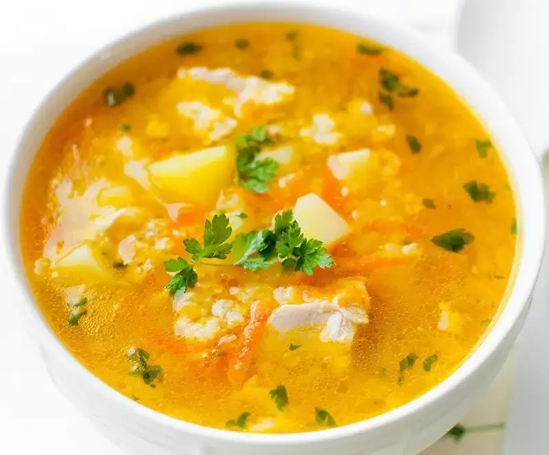 Когда картошка будет готова, окорочок нужно вынуть из бульона, а мясо аккуратно нарезать и вернуть обратно, убрав кожу и кости. Затем добавляется предварительно промытое пшено, которое нужно варить 5 минут. В завершение всыпьте пассерованные овощи, а когда пшено станет мягким, посолите, поперчите и добавьте зелень.