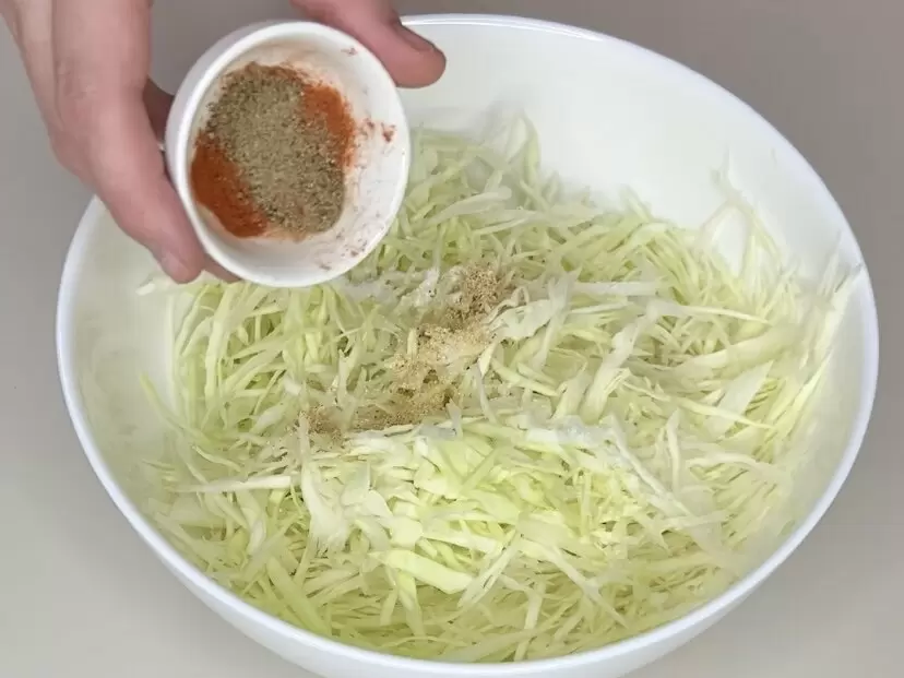 Для этого рецепта подойдут обычные продукты, которые, скорее всего, уже есть на вашей кухне. Капусту необходимо нарезать тонкими полосками. Идеально подойдет как белокочанная, так и пекинская капуста. После нарезки стоит добавить немного соли и ваши любимые специи. В данном случае речь идет о сладкой паприке, черном молотом перце и сушеном чесноке.