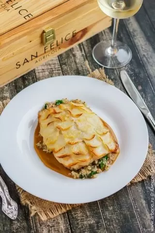 Приготовить это оригинальное блюдо можно с различными видами рыбы, включая треску и лосося. Вам не понадобятся экзотические ингредиенты, однако мандолина или острый нож будут отличными помощниками. Блюдо станет отличным выбором как основного, так и гарнирного блюда, благодаря универсальности картофеля, к которому можно добавить шпинат, киноа или зелёный салат. Но даже без гарнира рыба с картошкой станет вкусным и сытным угощением.