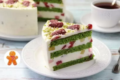 Все компоненты бисквита соединяются, и тесто выпекается в заранее разогретой духовке при температуре 180°С. После выпекания бисквит охлаждается, а затем разрезается на три коржа. Каждый корж щедро прослаивается йогуртовым кремом и украшен дольками клубники и желейными кубиками.
