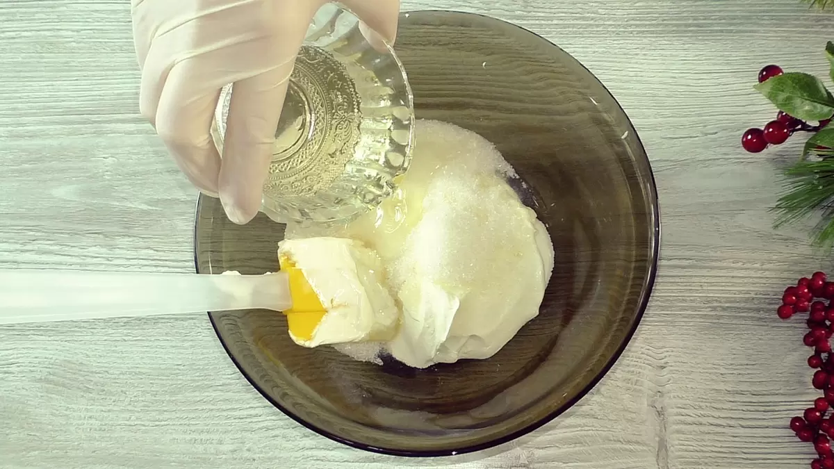В подходящей миске для замеса стоит объединить следующие компоненты: сметану, сахар, соль и растительное масло. Затем добавить манную крупу, тщательно перемешать и оставить смесь на 10 минут.