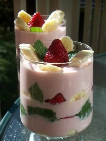 В высоких стаканах или фужерах начинать формировать слои: первым выкладывается слой фруктов, затем творожная масса, и так повторять, пока не закончатся ингредиенты, завершая последним слоем творожной массы. Декорировать десерт свежими фруктами или шоколадной стружкой.