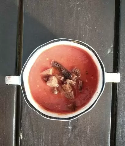 Процесс довольно прост: соединить томаты и соки, добавить рубленую зелень и чеснок, всё измельчить блендером. В конце добавить соль и посыпать накрошенным хлебом или гренками сверху.