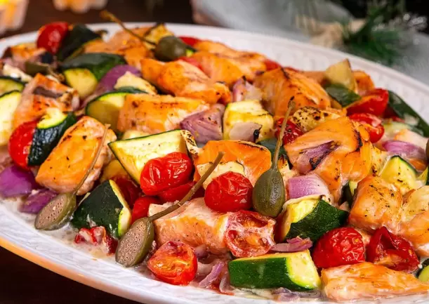 Запечённый лосось в компании овощей — идеальный выбор для новогоднего ужина. Такой способ приготовления позволяет сохранить все полезные вещества и витамины, а запечённая рыба порадует лёгкой корочкой и насыщенным вкусом. Низкая калорийность компонентов позволяет наслаждаться угощением, не переживая о фигуре. Добавляя ароматные овощи и пряные травы, можно добиться неповторимого вкусового акцента, который запомнится надолго.