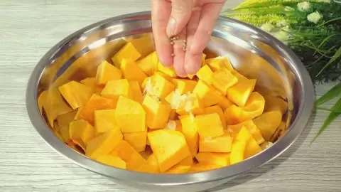 Для начала освободить тыкву от кожицы и нарезать ее на произвольные, но удобные для запекания кусочки. Рекомендуется добавлять чеснок — это придаст блюду особый аромат. Чеснок можно выдавить, а также добавить несколько семян кориандра для усиления вкуса.