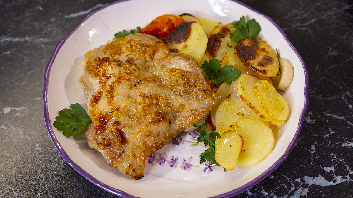 Когда блюдо готово, украсить его свежей зеленью. Нежные окорочка с картофелем и ароматным вином — отличный выбор для уютного ужина. Их насыщенный вкус наполнит ваш дом непревзойденным ароматом!