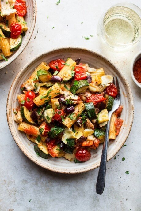 Освежающий рецепт пасты идеально подойдет для легкого ужина. Сочетание цукини, сладких помидоров черри и оливок придаст блюду яркий вкус и богатую текстуру.