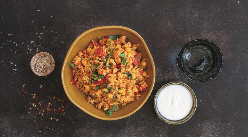 Плов из булгура с помидорами и нутом — это не только сытное, но и полезное блюдо, которое отлично подходит для любого времени дня. Его можно подавать как основное или добавить в качестве гарнира к мясным или рыбным блюдам, украсив густым йогуртом для дополнительного вкуса.