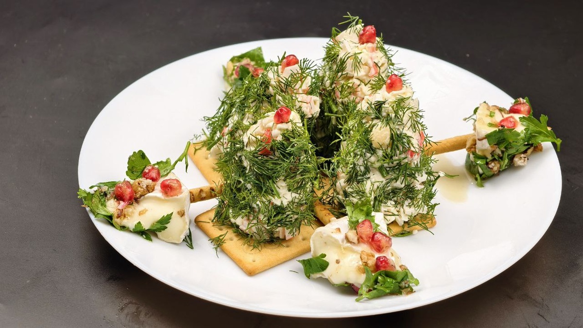 Первая елочка строится на крабовых палочках и плавленом сыре. Теркой натираем палочки и сыр, добавляем чеснок и майонез до нужной пластичности массы. Из массы формируем овалы на крекерах, украшаем укропом и зерном граната. Второй вариант — на базе сыра Бри: треугольники сыра обмакиваем в ореховой смеси с петрушкой и гранатом, затем enviados к соломке и меду. Оба варианта быстро собираются и не требуют варки.
