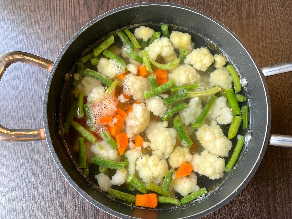 Первым шагом необходимо подготовить овощи. В большой кастрюле смешиваются цветная капуста, стручковая фасоль и нарезанная мелкими кубиками морковь. Далее все это заливается водой и доводится до кипения.