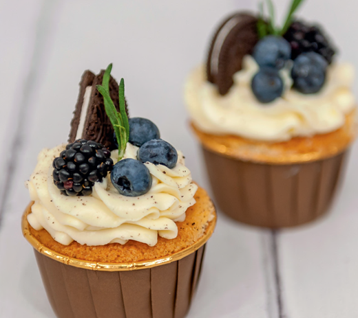 Для крема взбейте масло и сахарную пудру до однородного состояния, добавьте творожный сыр и перемешайте на низких оборотах, чтобы не переусердствовать. Наполните кондитерский мешок и украсьте каждый капкейк, добавив сверху ягоды или кусочки шоколада.