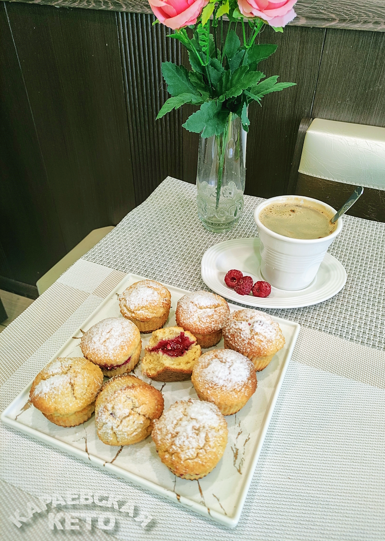 Формы для кексов заполняют тестом наполовину. В центр каждой порции выкладывают ягодный джем и покрывают тестом до краев. Выпекание происходит при температуре 180 градусов до золотистой коробочки, после чего готовые маффины нужно остудить и посыпать пудрой из эритрита.