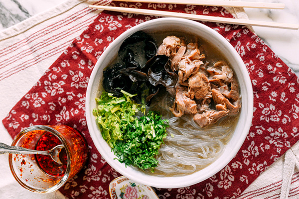 Разделите мясо, процеженный бульон влейте в миску вместе с лапшой и свежей зеленью. По желанию добавьте уксус и чили масло.