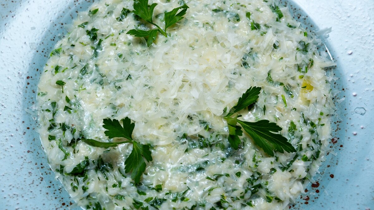 Пока рис готовится, мелко нарежьте рукколу, петрушку, кинзу и зубчик чеснока. Когда рис будет приближаться к готовности, добавьте сливки и перемешайте. Следом введите граммов 80-100 сливочного масла, добавьте зелень и чеснок, а также немного воды для получения кремообразной текстуры.