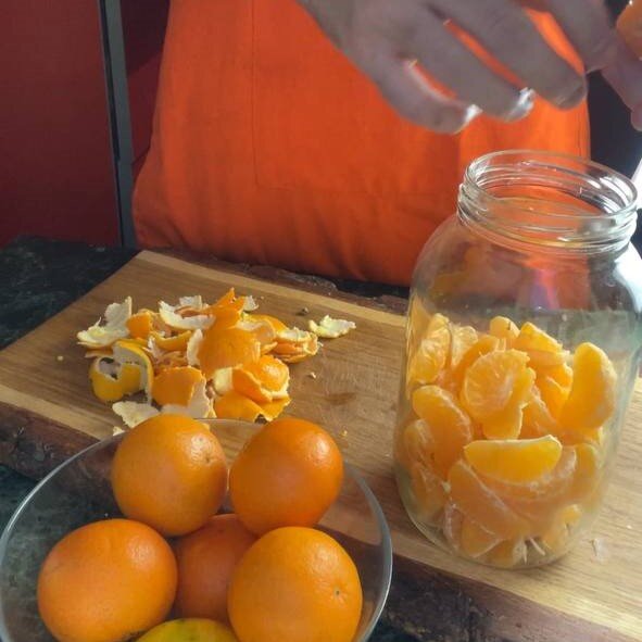 Первый шаг заключается в том, чтобы очистить цитрусовые от корок и поместить их в заранее подготовленную банку или емкость. Если вам нравятся немного горькие нотки в напитках, добавьте несколько корок от очищенных плодов.