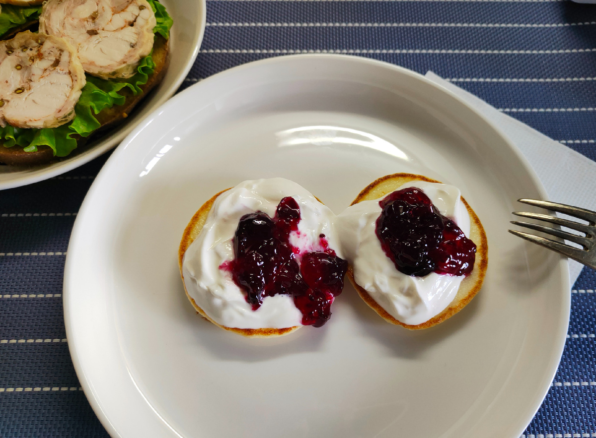 Завтрак: Утреннее разнообразие составили блинчики на сыворотке с творогом и вареньем из черной смородины. Блинчики были заранее заморожены, что позволило сэкономить время на их приготовление.