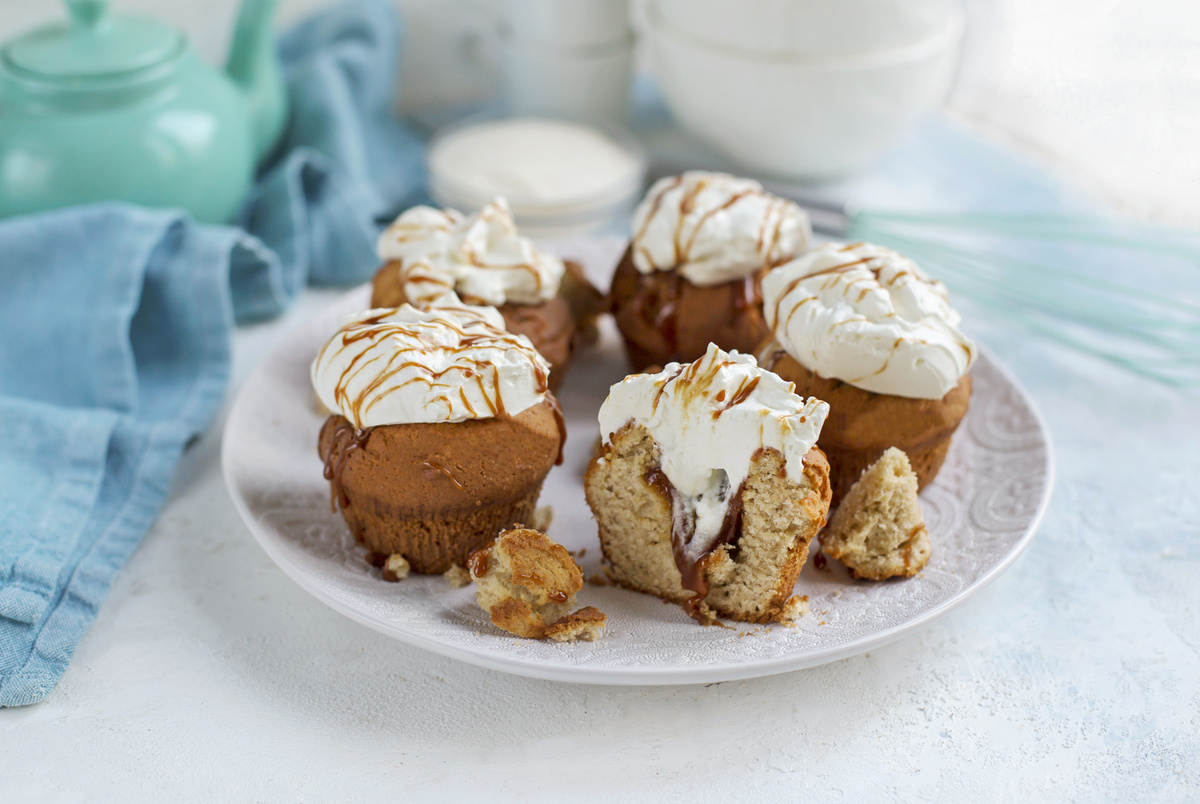 Шаг 5: Взбейте оставшиеся сливки до пышности и распределите по кексам. Полейте оставшейся карамелью и подавайте к столу сразу же.