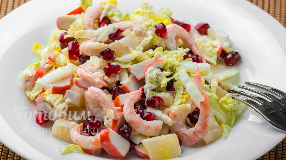 4. В глубокой миске объедините нарезанную капусту, крабовые палочки, ананасы, очищенные креветки и гранат. Тщательно перемешайте все ингредиенты.