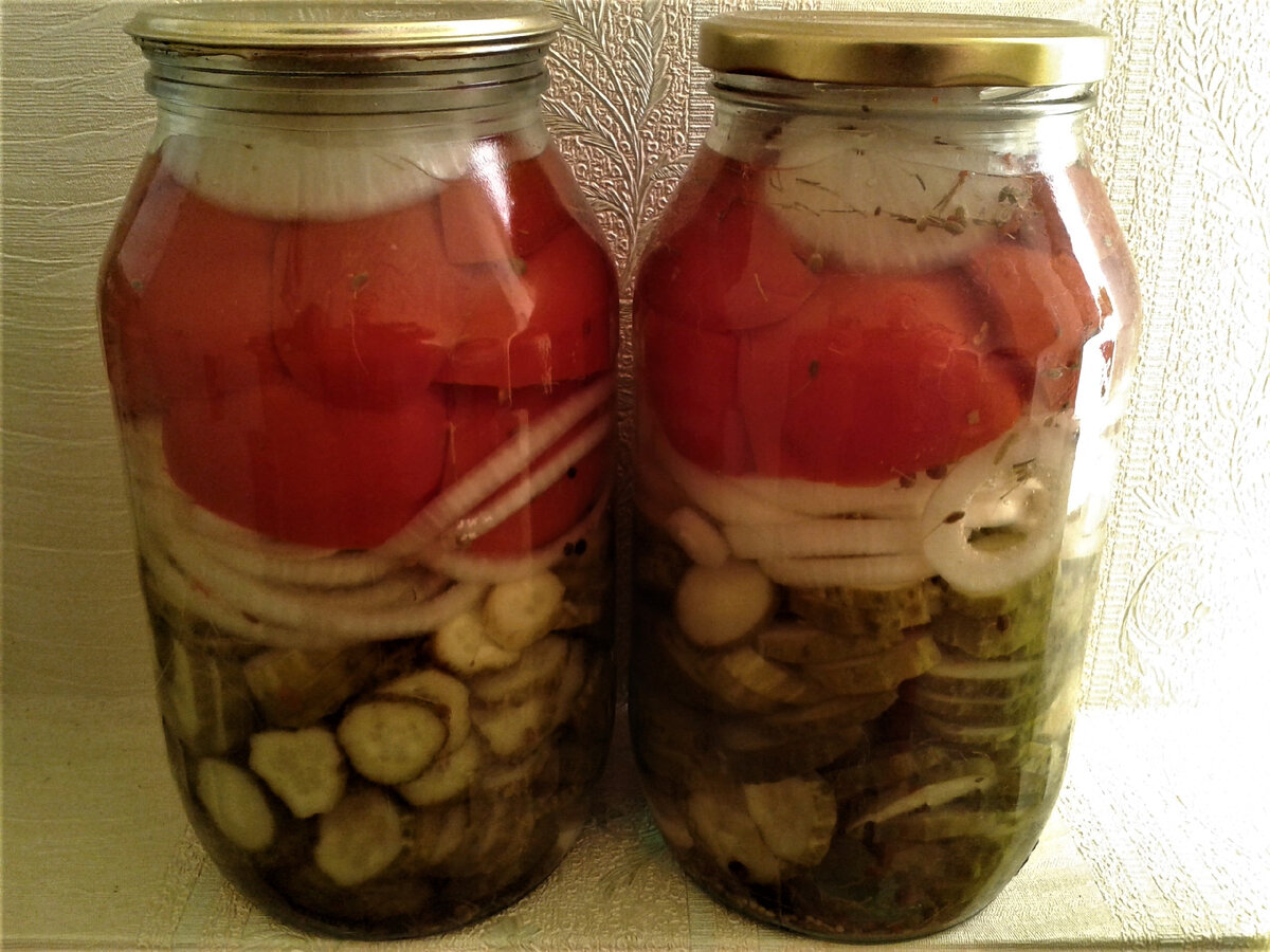 Для рассола подготовьте 1,3 л воды, добавляя: 3 ст. л. сахара, 1,5 ст. л. соли, и 2-3 ст. л. 9% уксуса. Помойте и очистите овощи, простерилизуйте банки и крышки. Огурцы и лук нарезать, помидоры - дольками. Специи уложите на дно банки, чередуя слои из огурцов и помидоров, а сверху добавьте растительное масло по 1 ст. л. на литровую банку.