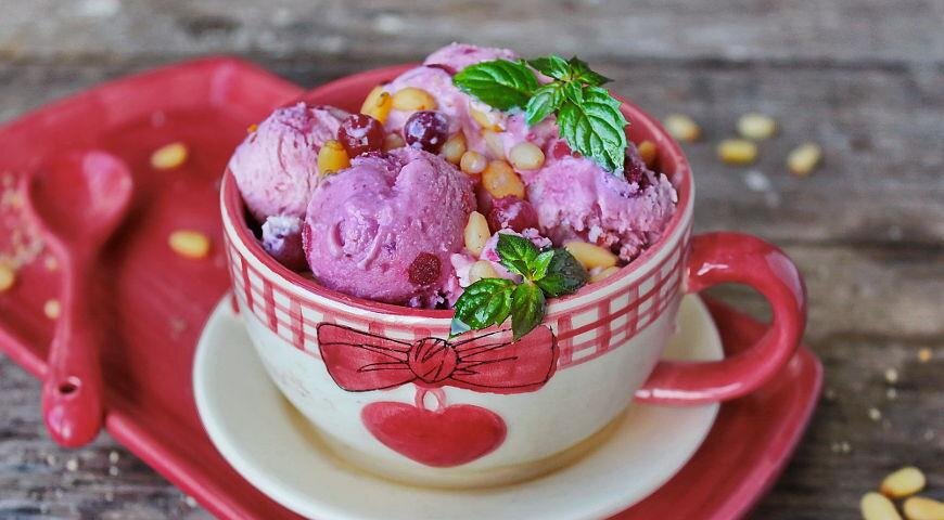 Сначала подготовьте ягоды, перебрав их. Затем из свеклы отожмите сок. Для этого можно натереть корнеплод и отжать массу через марлю. Сок следует соединить со сгущённым молоком, а оставшуюся свеклу сохранить для салатов или борща.С апельсина следует снять цедру и нарезать её мелкими кубиками. Далее выжать сок из фрукта.В сотейнике соедините ягоды, апельсиновый сок и кленовый сироп, добавив цедру. Уваривайте массу на умеренном огне до уменьшения объёма на треть. После этого аккуратно введите агар-агар и дайте смеси остыть до состояния, напоминающего мармелад.В отдельной емкости взбейте сливки до пиков.Соберите всё в одном контейнере: аккуратно смешайте свекольную, сливочную и ягодную массы, создавая вихри. Заморозьте приготовленное мороженое в течение 6-8 часов.Специально к подаче добавьте к кедровым орехам мяту или мелиссу для украшения.Наслаждайтесь истинным гастрономическим удовольствием с домашним мороженым!
