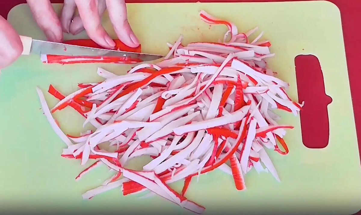 Крабовые палочки следует разрезать вдоль, а затем порезать каждую половинку на тонкие полоски.