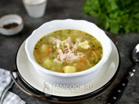 - Одновременно в другой кастрюле готовьте куриное бедро. Спустя 20 минут добавьте нарезанный картофель и варите еще 10 минут, после чего добавьте сваренную перловку.