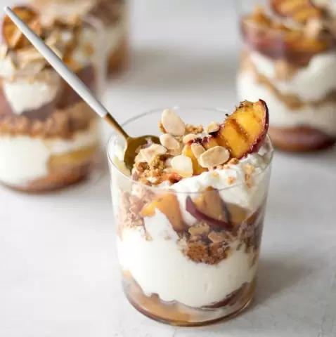 Теперь начинается самое интересное — сборка десерта. Лучше всего использовать креманки или прозрачные стаканы, чтобы слои были видны. Важно чередовать слои печенья, крема и персиков до тех пор, пока не закончатся ингредиенты. Завершите сборку щедрой порцией крема и украсьте свежими персиками и мятой.