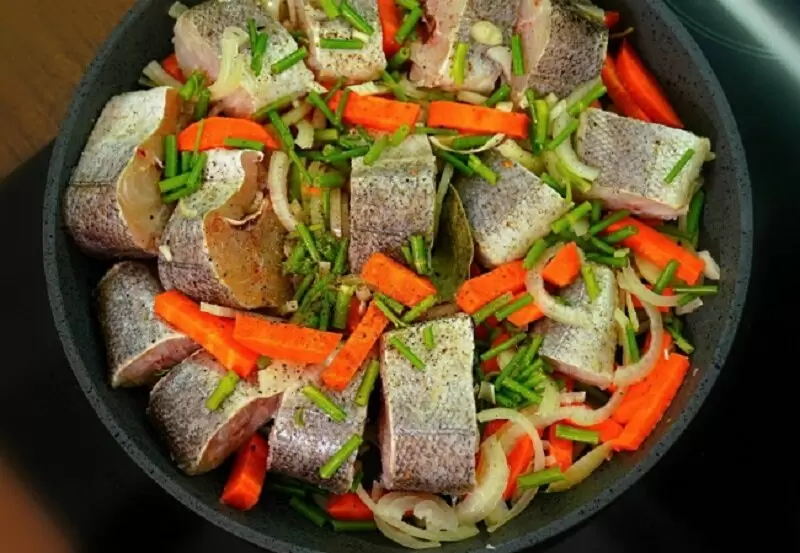 Добавьте к овощам куски рыбы и оставшуюся часть нарезанных ингредиентов. Украсить блюдо свежим укропом, добавить лавровый лист, а также дополнительную соль и перец. Уменьшите огонь до среднего, накройте сковороду крышкой и готовьте на плите в течение 25 минут. Этот процесс позволяет рыбе и гарниру готовиться одновременно, что существенно упрощает приготовление.