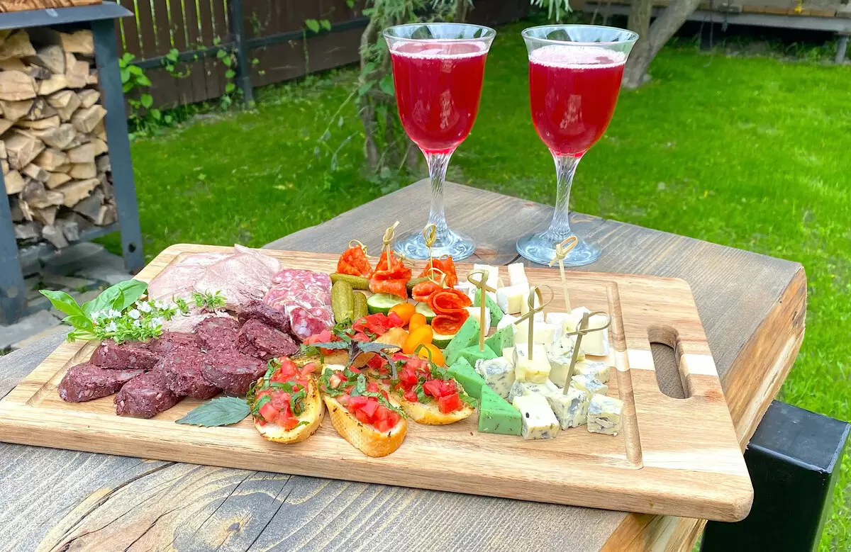 На ужин в эту пятницу было решено готовить куриные бедрышки с шампиньонами на мангале, а также организовать различные закуски. Из доступных ингредиентов состояла доска с покупными закусками, где лишь язык был приготовлен самостоятельно. Тем не менее, был еще один хит — гренки с помидорами, или, как их называют, брускетты. Это отличная закуска для любого угощения. Вот как они были приготовлены: