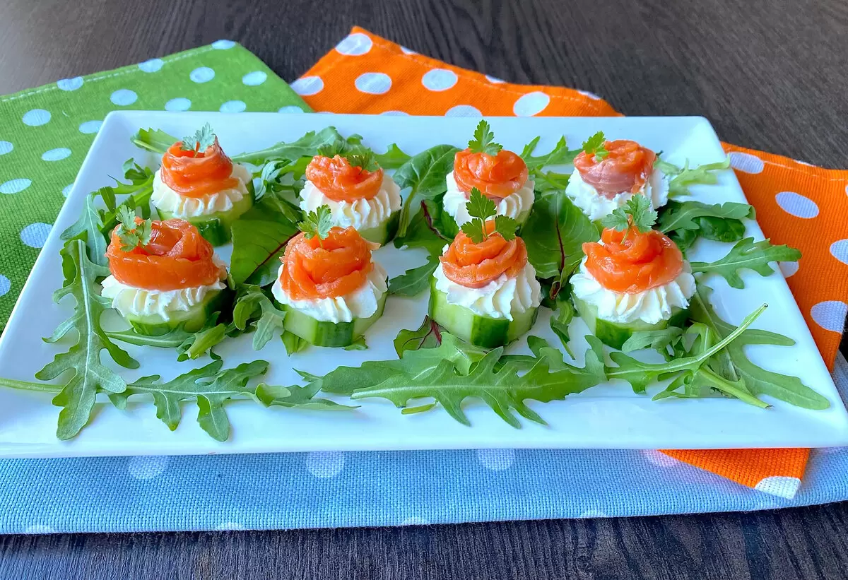 Эта закуска подходит не только для девичников. Хрустящие огурчики с творожным сыром и нежной красной рыбой способны привлечь внимание даже мужчин. Блюдо выглядит эффектно и готовится всего за несколько минут, что делает его идеальным для званого ужина или фуршета.