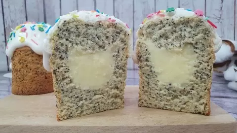 После выпечки дайте куличам остыть в выключенной духовке с приоткрытой дверцей. Когда они остынут, срежьте верхушки и заполните лепешки лимонным курдом, накрыв обратно отрезанными частями.