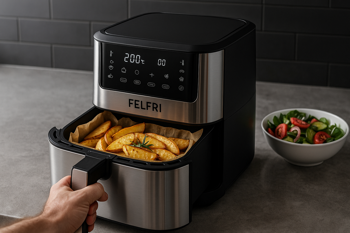 Оптимальным вариантом станет аэрогриль FELFRI с объемом 8 л и мощностью 2000 Вт, который предоставляет множество преимуществ: он быстро разогревается и имеет 8 предустановленных программ (выпечка, жарка, запекание), что даст возможность варьировать подходы к кулинарии. Удобство использования обеспечивают электронный таймер и дисплей, а также оптимальная температура в диапазоне от 80 до 200 °C в сочетании с керамическим покрытием внутренней чаши.