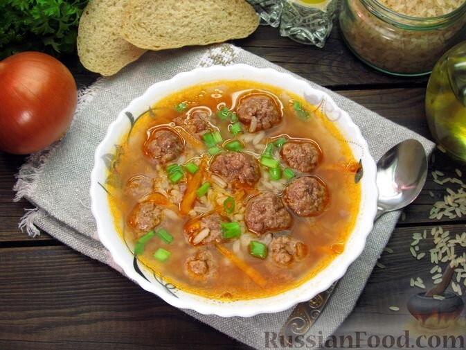 - Рисовый суп с фрикадельками: экономит время, так как бульон не требуется, а томатная паста придаёт приятную кислинку.