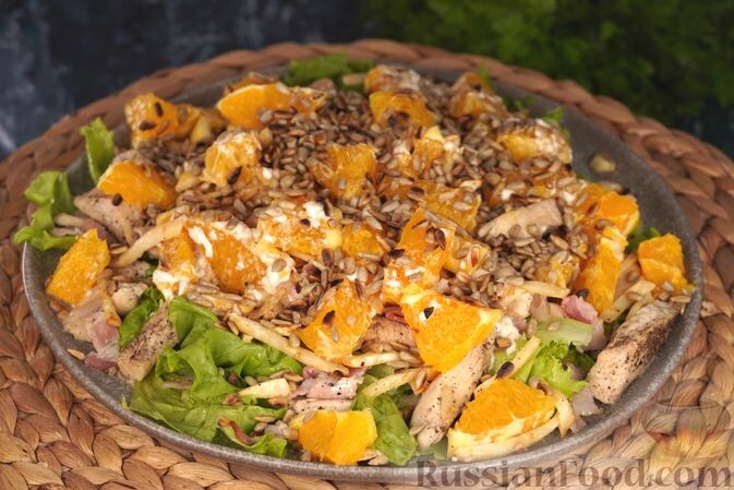 - Салат с курицей, сельдереем и апельсином. Это гармоничное сочетание обжаренного куриного филе и сладкого апельсина, дополненное хрустящим сельдереем, точно подарит оригинальные вкусовые ощущения.