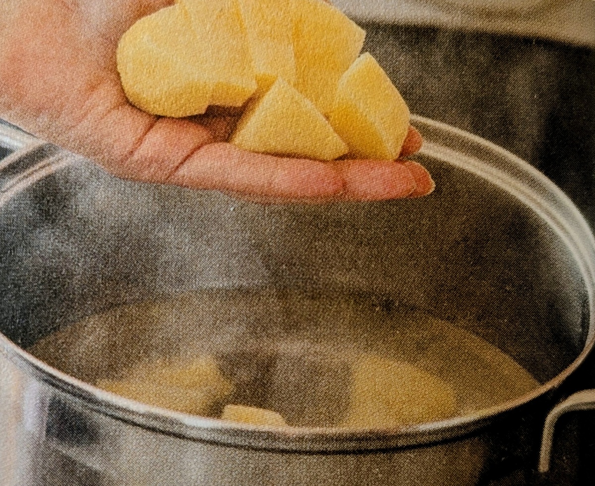 Приступим к процессу готовки. Начните с того, чтобы довести до кипения бульон или воду. Тем временем, подготовьте картофель — нарежьте его крупными кубиками и добавьте в кипящий бульон.